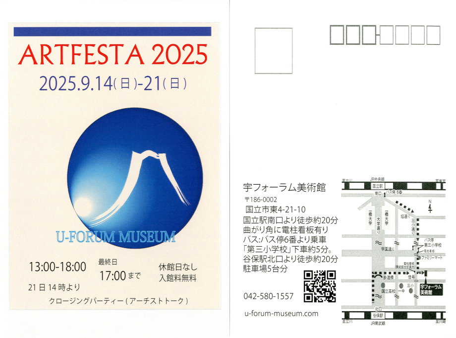 | アートフェスタ 2025年 9月14日(日)~21日(日) 13:00~18:00 (最終日は17:00まで) アーティストトーク・クロージングパーティー(21日 14:00~) 宇フォーラム美術館 ※入館料無料・会期中無休 (東京都国立市東4-21-3) MAP |