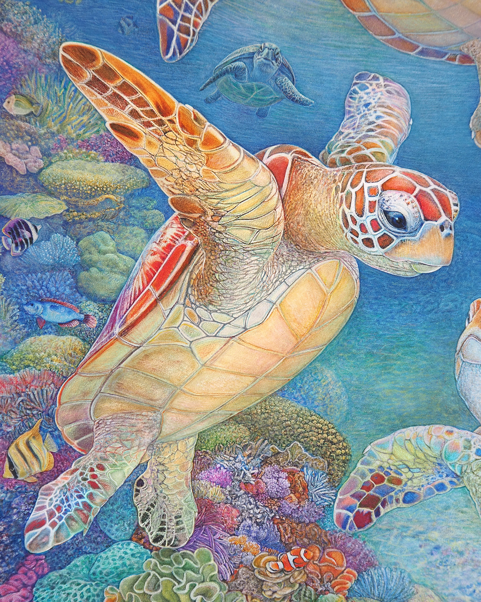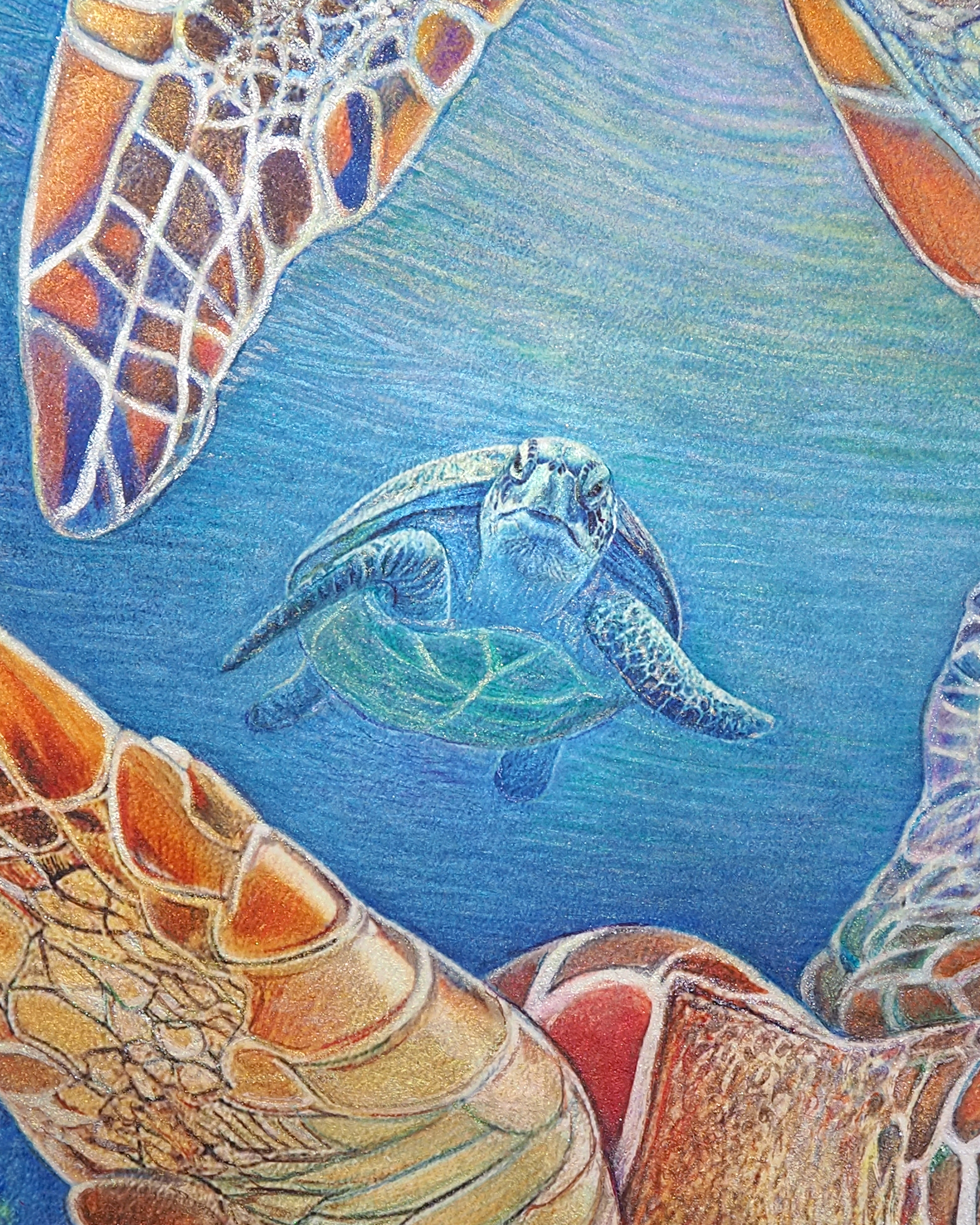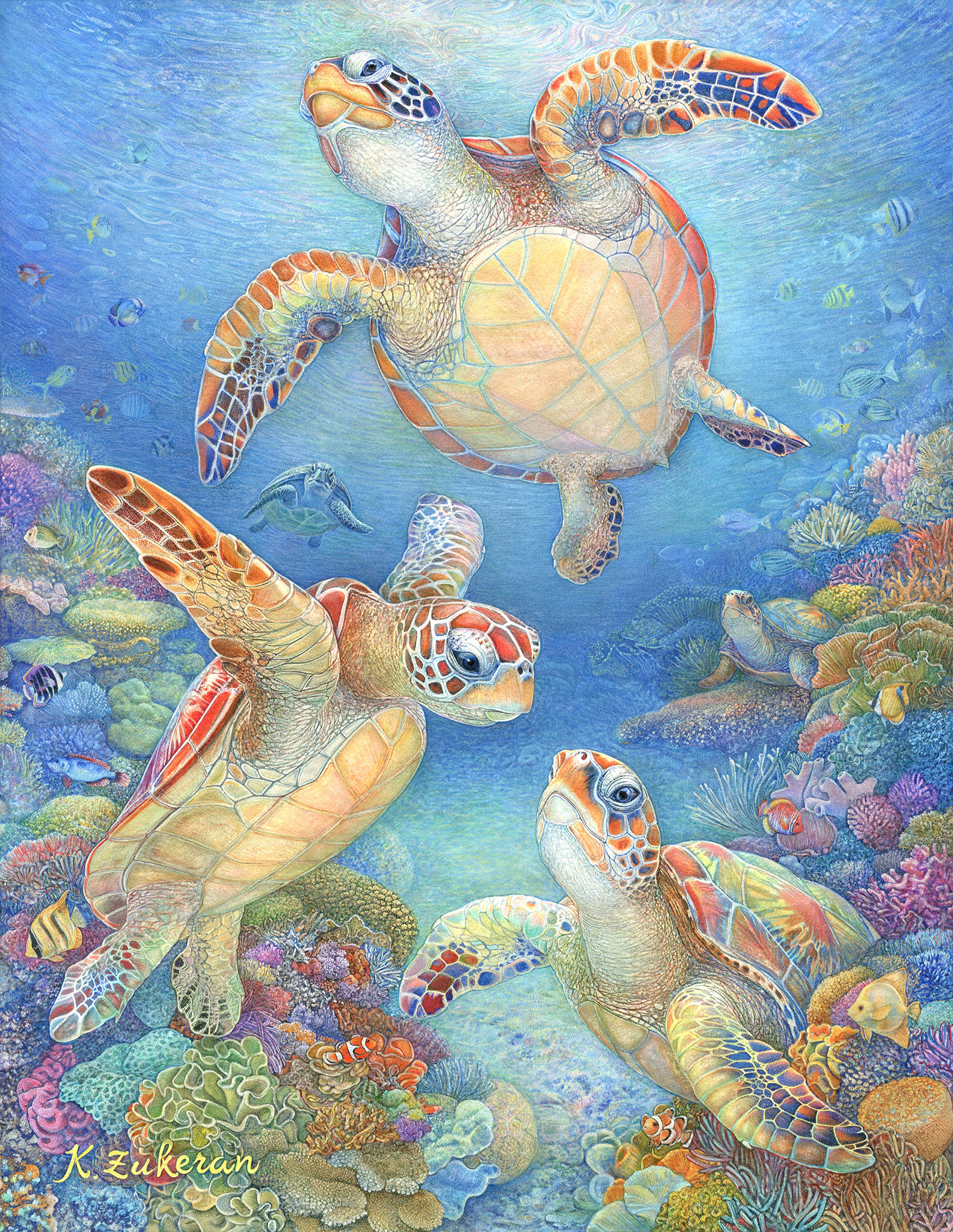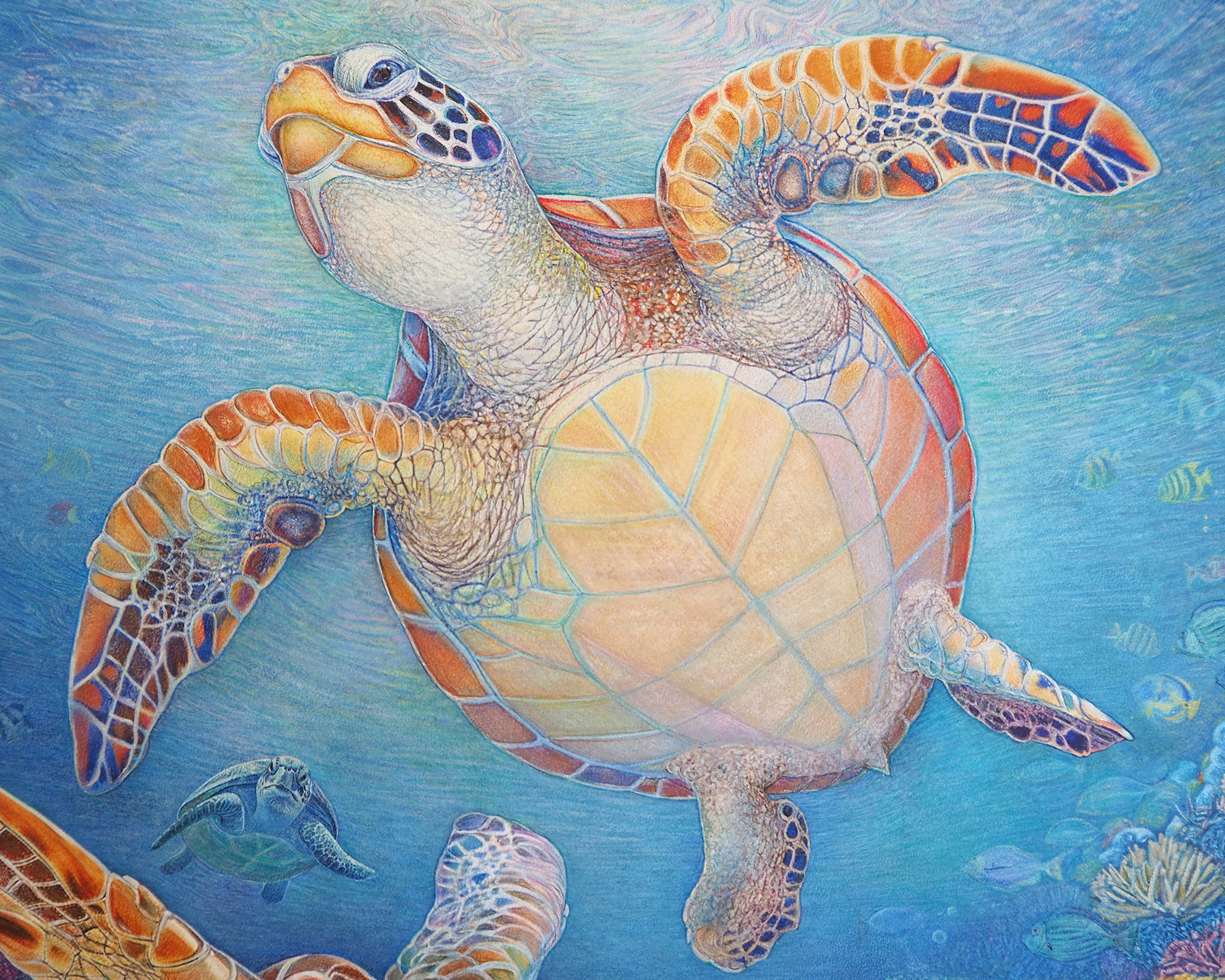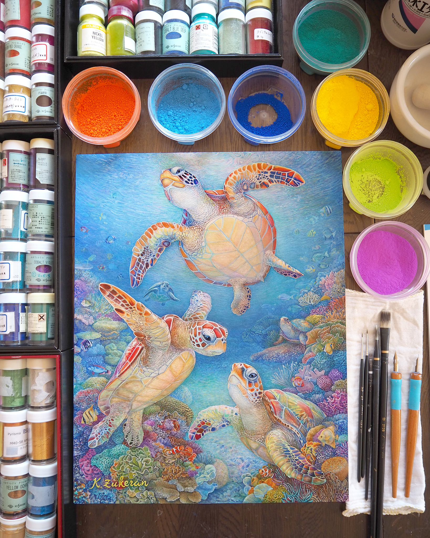 『 美ら亀三姉弟 』 フレスコ画 / 画寸:41.0×31.8cm (F6号) ・ 額寸:55.0×46.0cm